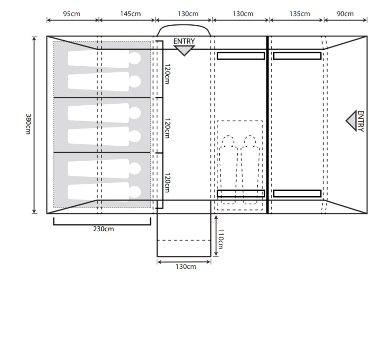 - 240cm deep, darkened micro polyester 6-person bedrooms with 2/2/2 dividers