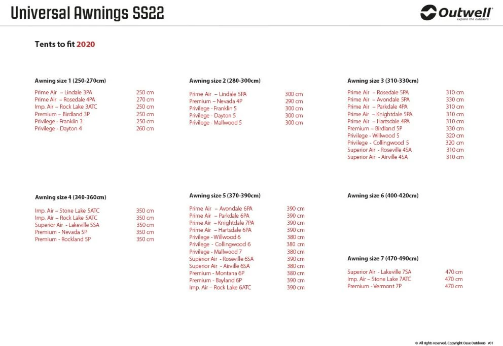Designed to fit all Outwell inflatable and poled tents (except Encounter tents), you can easily extend yours with an Outwell Universal Awning. As superbly engineered and carefully crafted designs, each is easy to attach so you can quickly add sheltered space to your living area for relaxing or to use it as storage. With steel poles and Outtex® 4000 Select fabric, the sturdy design is stable and durable whilst for practical access via the sloping front door, each has a fold-flat groundsheet.